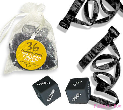 CONTENT: 2 Black Bondage Restraints, 2 Dice (Action / Body), Organza Bag
