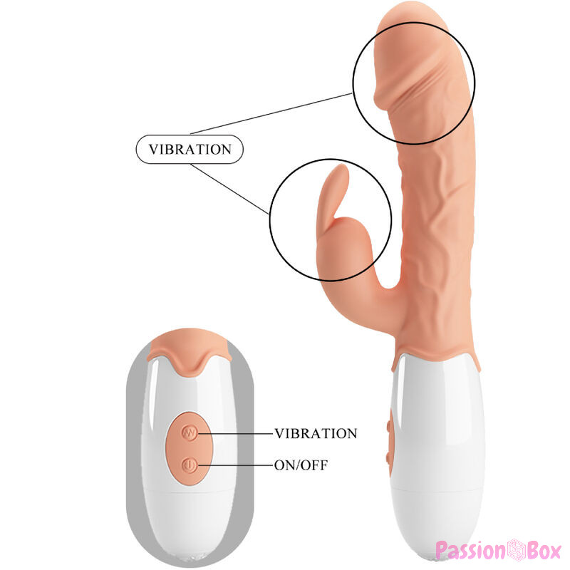 Flesh-colored TPR rabbit vibrator with two motors. One on the tip of the shaft, the other inside the bunny-shaped clitoral stimulator. It is a wonderful vibrator with a large head G-spot tip and a very strong clitoral stimulator for simultaneous vaginal and clitoral stimulation to double the amount of pleasure. It is very flexible and this means that it can always hit the G-spot or clitoris. The 2 powerful motors have 30 intense vibration modes and can be easily controlled with the push of a button.