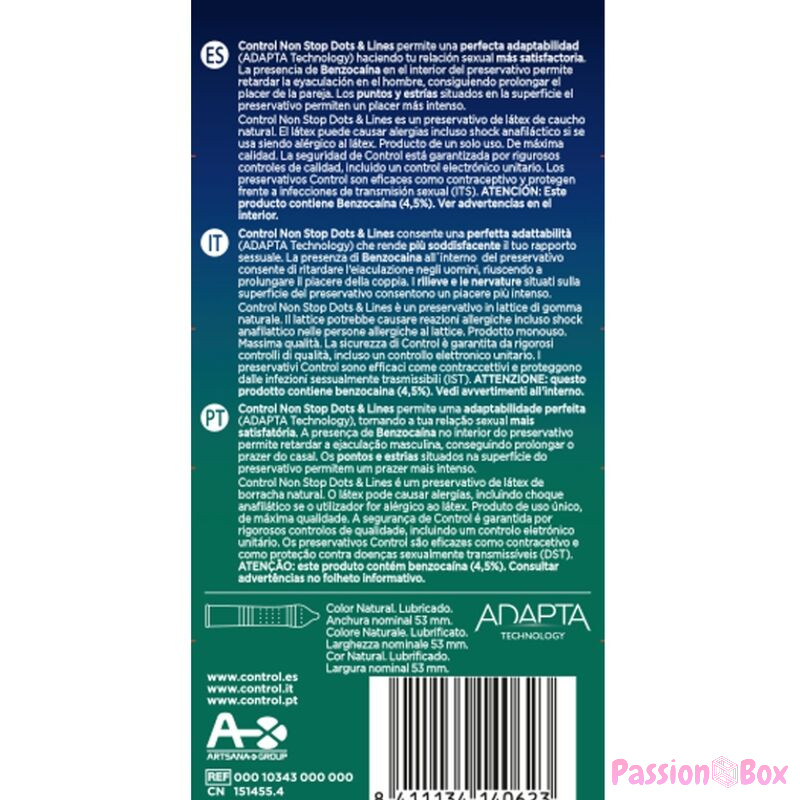 Striated condom made of transparent natural latex, lubricated and anatomically fitting, with a Benzocaine-based retarding effect.