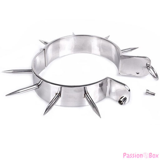 This chrome metal collar locks with an included allen key. It has a shiny finish with pointed tips. The collar has an O-ring to attach a carabiner chain, rope or any other bondage item.