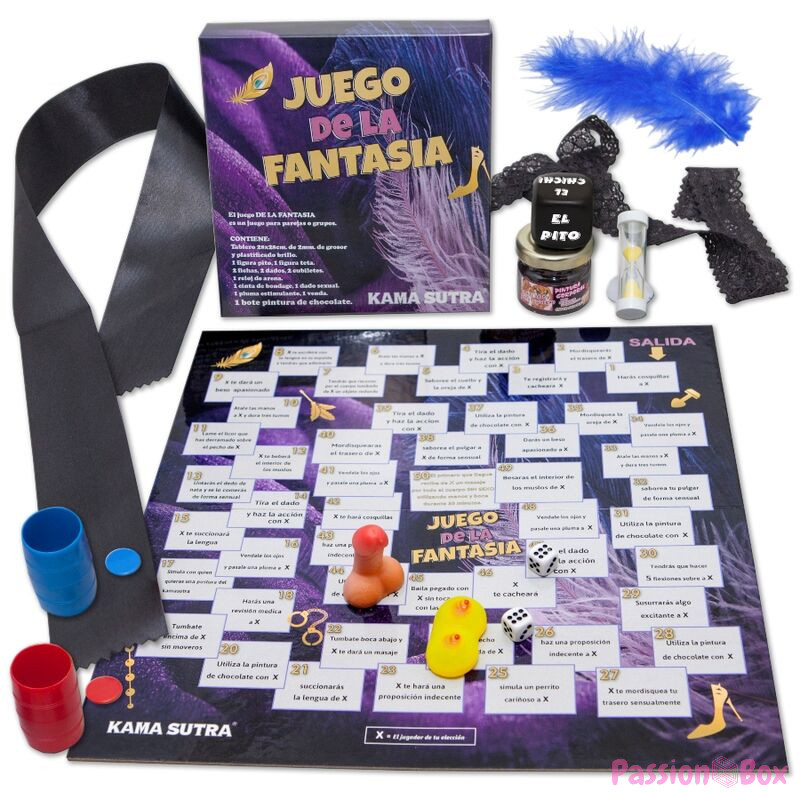 IT CONTAINS: POT OF EDIBLE PAINT CHOCOLATE FLAVOR 30 ml, INSTRUCTIONS, BONDAGE TAPE, EYE BAND, STIMULATING PEN, A HIGH QUALITY DICE, HOURGLASS, 1 PENIS FIGURE AND TIT FIGURE, 2 TOKENS, 2 CUVETTES, 2 NUMBERED DICE AND A PLASTICIDED BOARD.