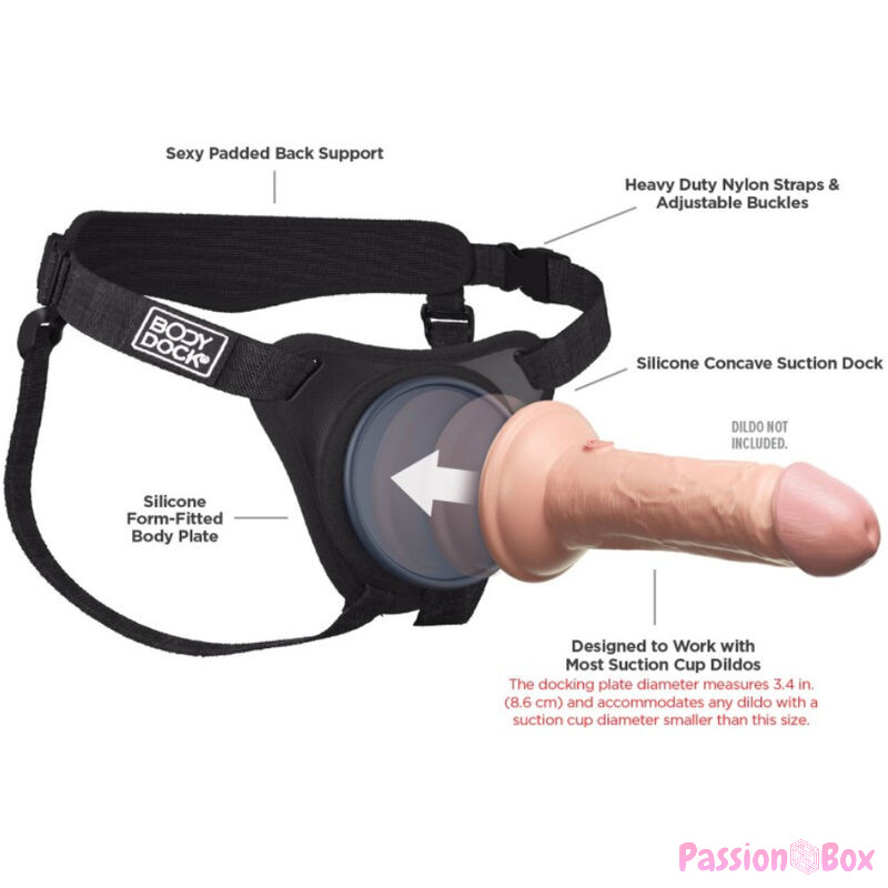 The patented Body Dock Elite takes strap-on play to a whole new level! It features a premium silicone docking plate that conforms to the shape of your body for the ultimate fit. Also included are adjustable side-release buckles and padded back support. Changing your favorite strap-on accessory has never been faster or easier! It’s as simple as attaching the suction cup on your favorite dildo or vibrator to the docking plate, while the nylon straps easily adjust to fit most sizes and body types. Best of all, it works with most dildos on the market today, including some you may already own. No rings. No snaps. No hassle!
