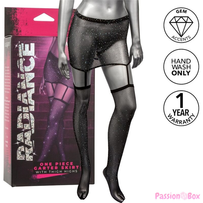 Introducing the captivating Radiance Garter One-Piece Skirt and Thigh High Stockings, a seductive ensemble that fuses a mini skirt, garters and thigh high stockings into one stunning piece. Made from soft, stretchy materials, it ensures a perfect fit and luxurious feel against your skin.