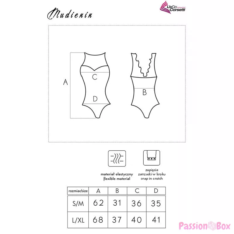 The Mudienin model is a universal black bodysuit that will work not only in the bedroom, but also as part of an everyday outfit. The design uses sensual and feminine lace and smooth, subtly shiny material, which together guarantee an effect of chic and sensuality. The bodysuits have a classic cut with a cutout at the back. They reveal the buttocks while covering the bust area with subtle lace. The lace accent also appears on the back of the costume, which draws the eye to women's shoulder blades and arms.