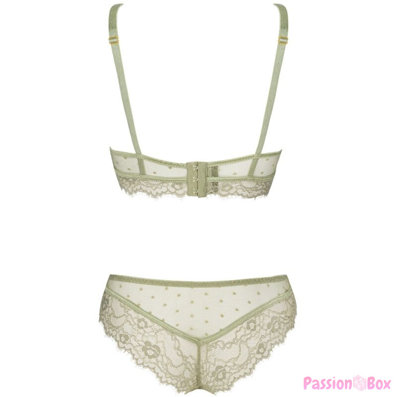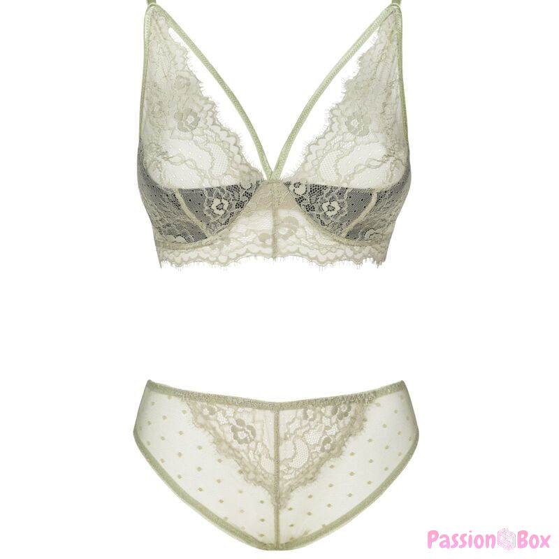 The lingerie set is a lace work of art. The bra is not stiffened and is additionally equipped with two straps on the neckline, so when peeking out from under a shirt or blouse, it will certainly attract great attention. The bra supports the bust well, which means that women with larger breasts will also be able to wear it. Tempting underwear in off-green color also includes comfortable and at the same time sensual lace panties, which, even though they are slightly more built, still create a sexy atmosphere. The design of the panties perfectly highlights women's buttocks, making every woman feel special. The set is perfect for everyday wear as well as for slightly more special moments.