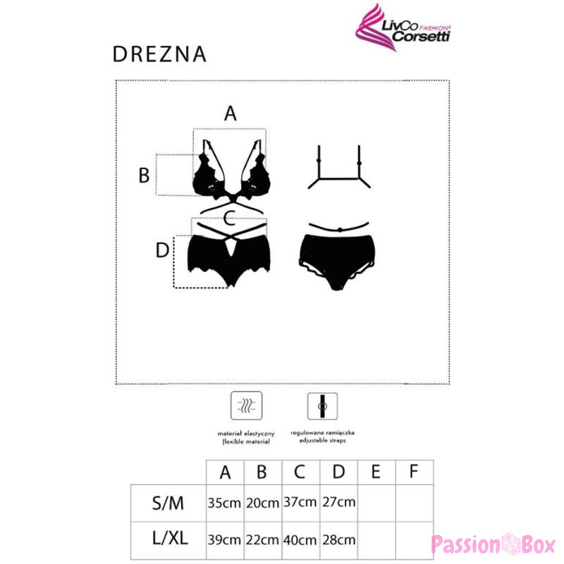 The sensual Dresden set is a unique product that combines elegance with sex appeal. The set consists of two parts - a soft, lace bra and lace, transparent hipster panties. The material from which the set is made is flexible. It is available in a classic black color decorated with gold fasteners.