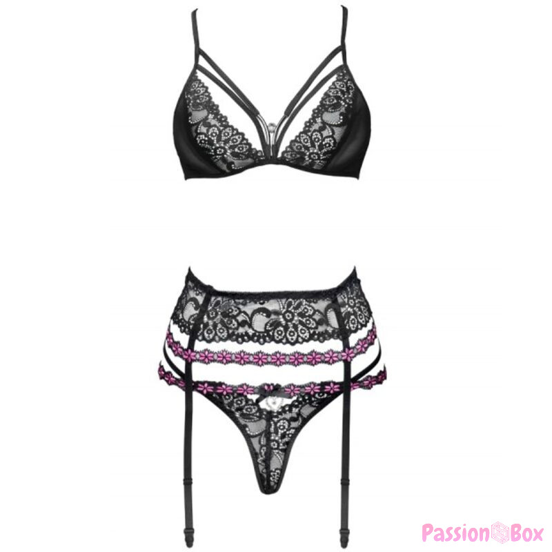 An exclusive, classy lingerie set made of intricate black lace. A flirtatious bra with thin straps that cross at the back, decorated with straps and silver jewelry. Elegant garter belt tied at the back with a satin ribbon. An additional decoration are two ribbons of pink flowers. The set includes a tempting thong with a small silver heart.