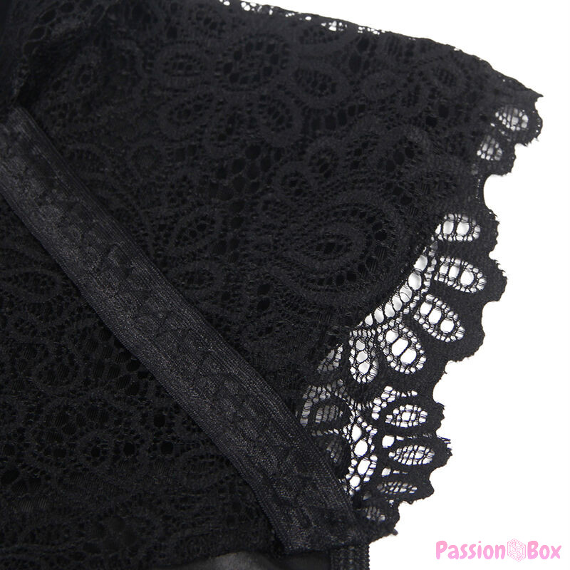 - Sophisticated Design: This lingerie dress combines black lace with leather details, creating a visually striking contrast that exudes sensuality and sophistication.