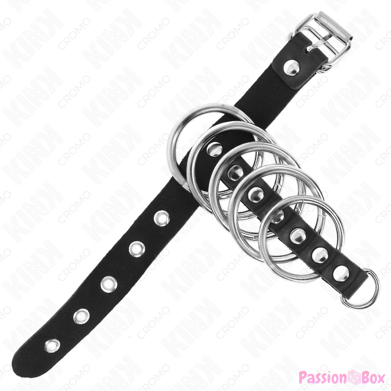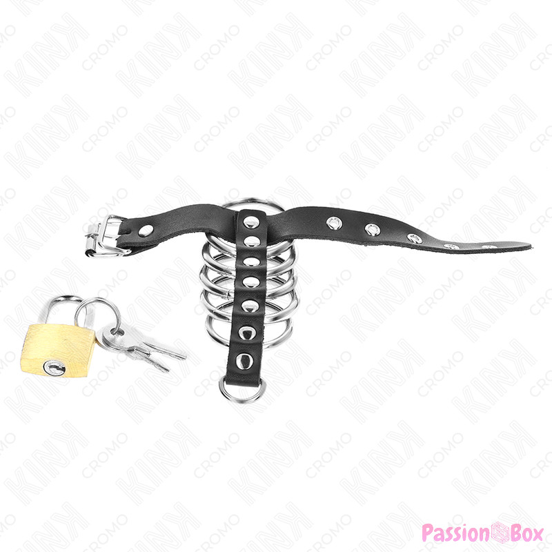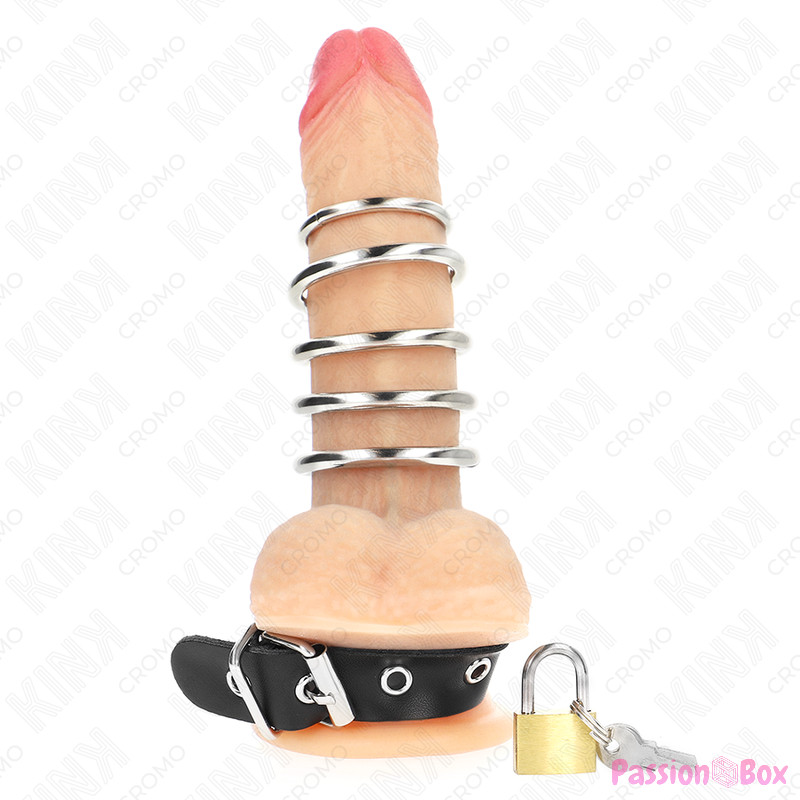 KINK - LEATHER PENIS RING WITH LOCK STRAP 21 X 2 CM AND 5 METAL RINGS FROM 3 CM TO 4 CM