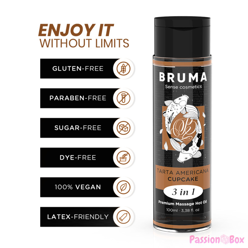 The Premium Heat Effect Massage Oil cupcake flavor from the BRUMA brand is a true gem in the world of well-being and intimacy. This exquisite product, presented in an elegant 100 ml container, is Designed to provide a unique and sensual experience, providing a relaxing and stimulating massage with a touch of warmth that makes it even more special. here Here are the highlights developed in detail: