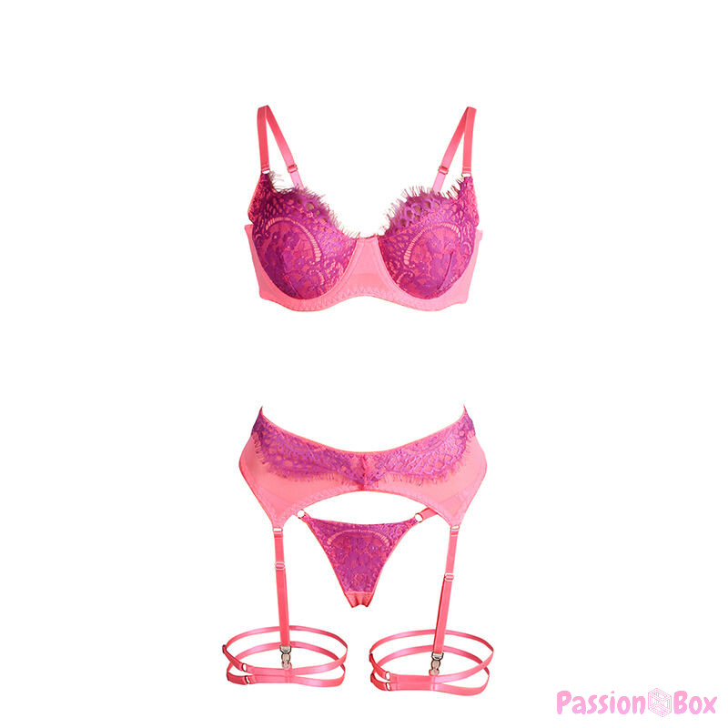 The delicate and feminine pink color brings a romantic air that perfectly combines with eyelash lace, known for its fine texture and ethereal appearance. This set is ideal for both special occasions and to add a touch of sophistication to your everyday life.