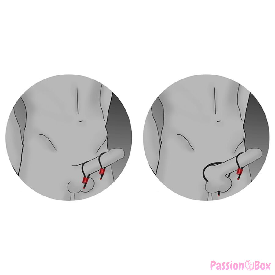 ElectraStim Prestige ElectraLoops can be worn in a variety of different ways. Two of the most popular configurations are shown below; both loops worn on the shaft or one on the shaft and one around the scrotum.