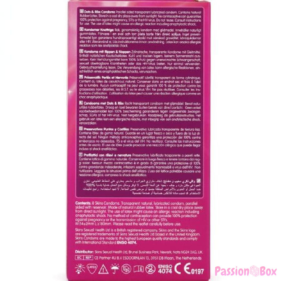 Enhance your condom offering with the new Skins Dots & Ribs 8-Pack, a ready-to-use product that delivers superior performance and greater value. With up to 33% more condoms per pack than the market leader, this product is perfect for retailers looking to increase customer satisfaction and purchase value. Designed for mutual pleasure, Skins Dots & Ribs condoms feature raised ridges and strategically placed textured dots. The ridges enhance stimulation for the wearer, while the dots are designed to intensify sensation for both partners, working together to increase pleasure for both. Made with premium natural latex and ultra-thin for a second-skin feel, these condoms offer exceptional strength, clarity, and comfort.