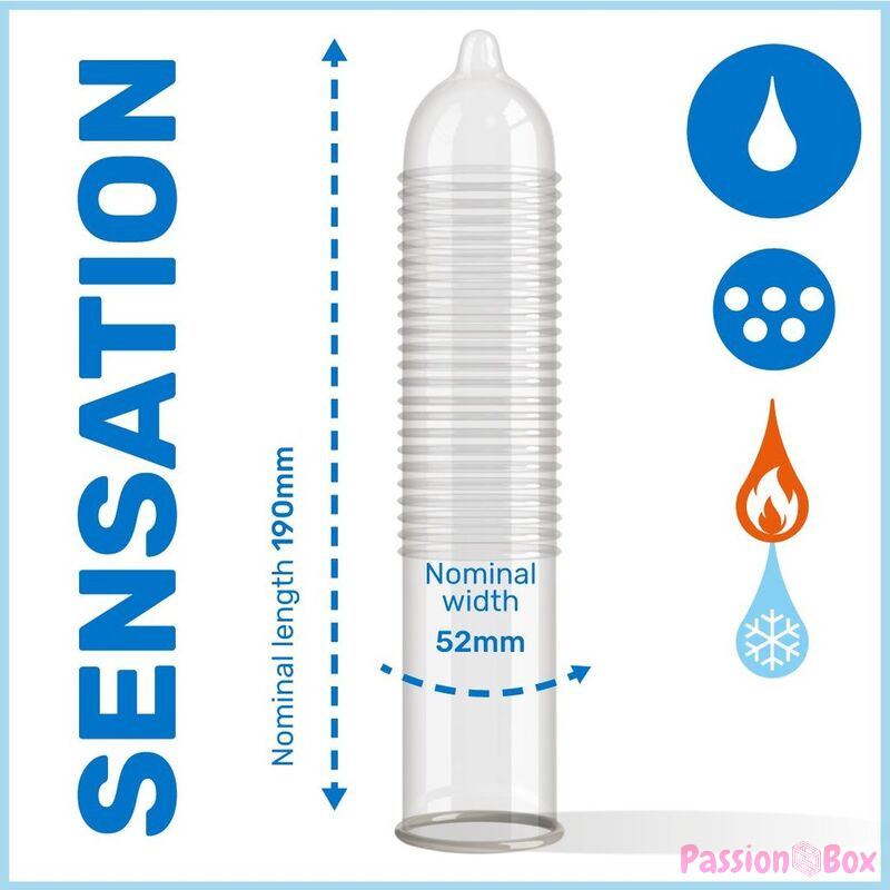Pasante Climax contains a mix of ribbed condoms with a sensation of heat effect or cold effect. Parallel, textured, natural color.