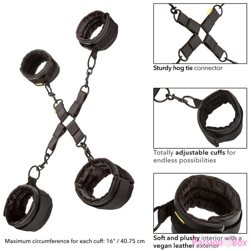 Bind your submissive partner with their hands and feet behind their back (or in the front) and take full advantage of their position. With 2 fully adjustable ankle cuffs and 2 fully adjustable handcuffs bound with Velcro-style hook and loop fasteners, this hog-tie also comes with universal clasps and o-rings with a swivel design for full dexterity and maximum comfort, while being totally bound.