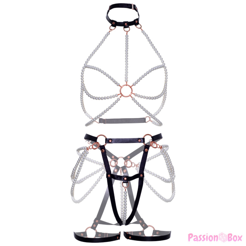 Enhance your charm with our 2-piece halter harness, adorned with faux pearls and an O-ring centerpiece. Made from ethical vegan leather, it is both fashionable and adaptable. The convertible style gives you the option to wear it with or without the detachable panty, showcasing alluring strands of pearls. Let your inner grace shine and embrace a touch of refinement on every occasion.