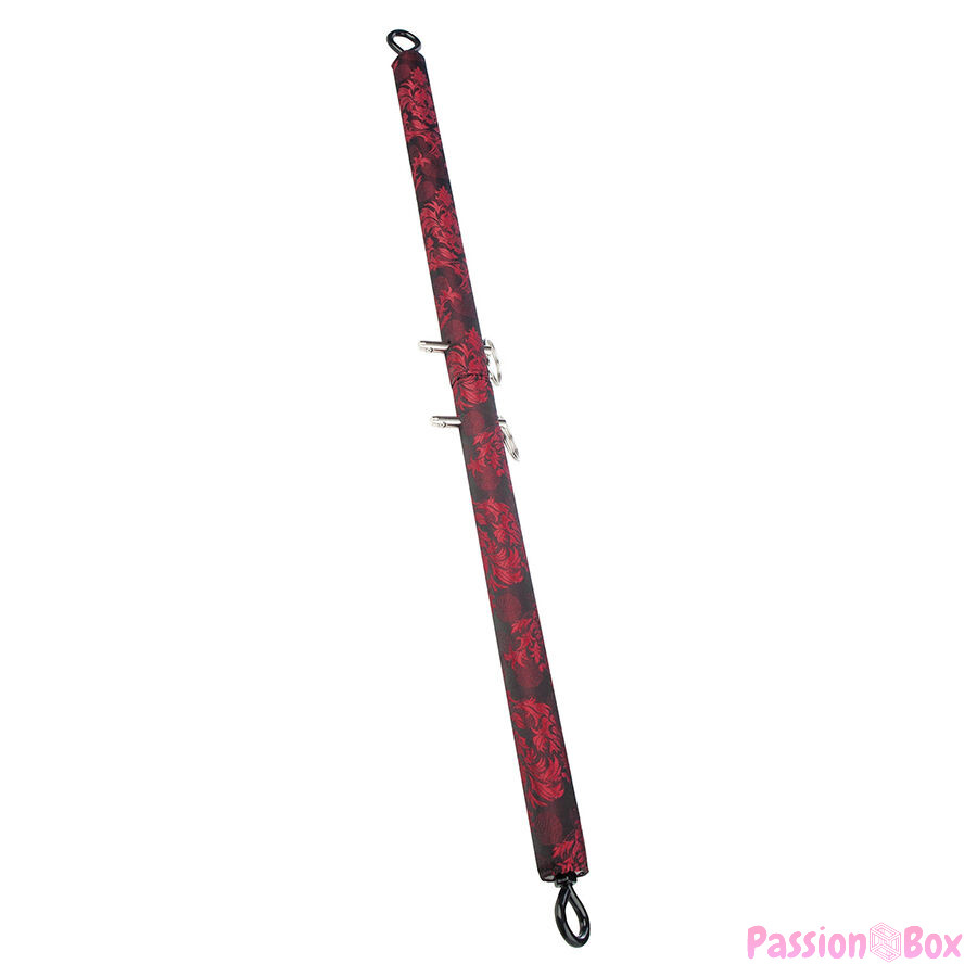 Relinquish control and dive into desire with the Scandal Spreader Bar. This sturdy, adjustable metal bar is wrapped in luxurious red and black designer fabric and features universal O-rings to connect your favorite cuffs. With an extendable width of up to 36 inches, it’s designed to hold your legs open in the most seductive positions—perfect for teasing, pleasing, and surrendering.