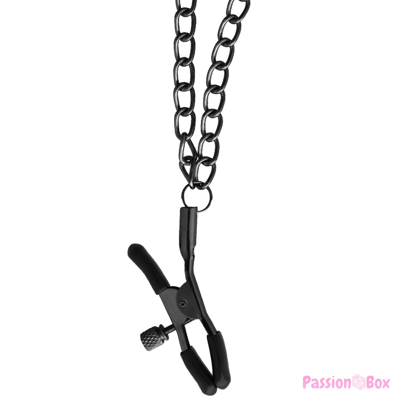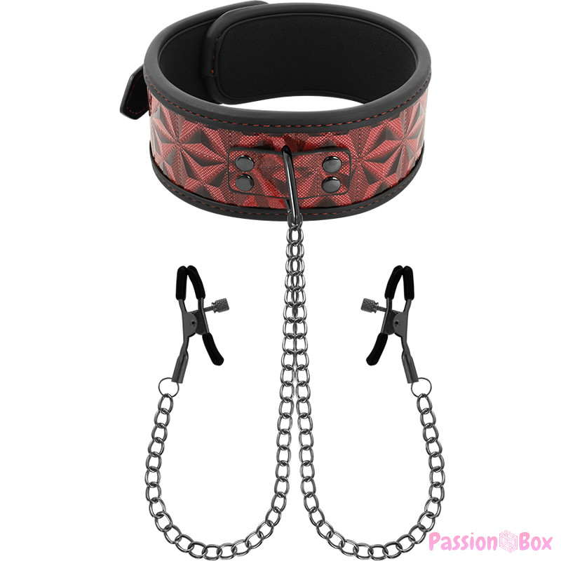 Ready for maximum pleasure ?, linked by a silver chain to nipple clamps. An exciting bondage game especially for them. The clamps and the collar are adjustable both in measure and tension. It is perfect for stimulating the nipples and many other sensitive areas.