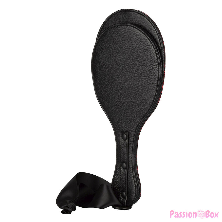 For the nights you're feeling extra naughty, indulge in the indulgent taps of the Scandal® Round Double Paddle. Effortlessly plant stinging taps on your submissive with the plush dual layer paddle and sturdy handle. Punishment and pleasure go hand in hand with the dual paddle with an edgy leatherette interior and silky brocade exterior. The sub in your love will love each stinging spank of this sturdy double stitched paddle and obey your every command as the dual paddle delivers powerful clapping slaps.The plush paddle is designed for both beginners and experienced erotic lovers to try out gentle taps for anyone looking to explore or plant breathtaking slaps that experienced fetishists crave. Unleash naughty desires and enjoy an evening of uninhibited pleasure play.
