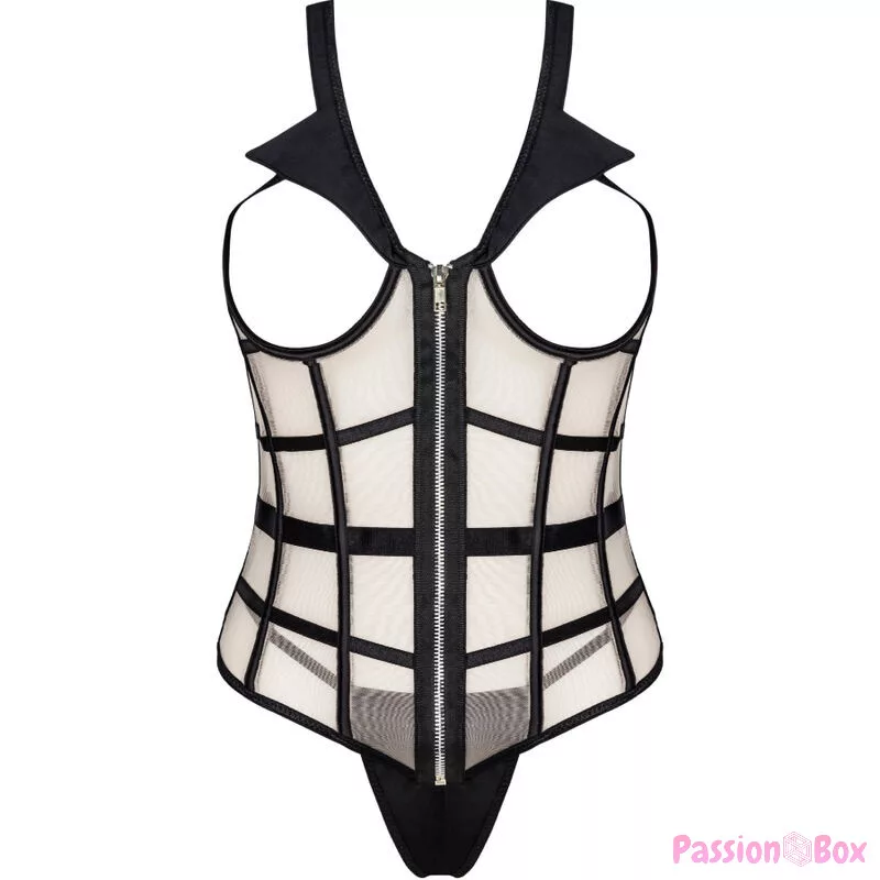 A two-piece set consisting of a sensual, busty corset and a sexy black thong. The corset has a zipper at the front, making it easy to put on. The colors of the set are black and beige, which together create an attractive combination. It is also worth paying attention to tempting details such as a black collar or black belts arranged in such a way as to best highlight the waist. What stands out most about this corset are the cutouts that expose the bust. This makes the whole set very daring and provocative. Not much is left to the imagination. Nipple stickers will be a great addition to the game and add some spice.