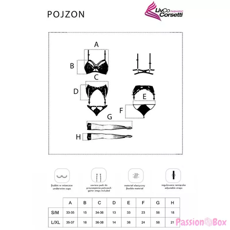Pojzon is an excellent choice for every woman. This unique set of women's underwear is a combination of elegance and sensuality. It consists of a black bra, panty, garter belt and stockings that perfectly complement the whole look.