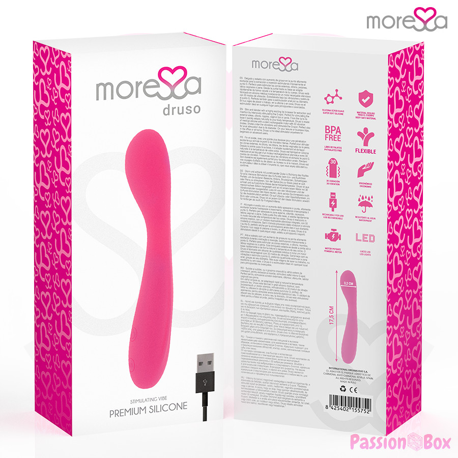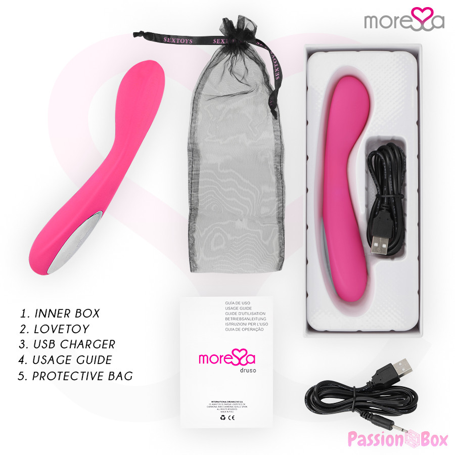 Druso is made of medical silicone incorporating a silent rechargeable motor with 30 vibration modes.