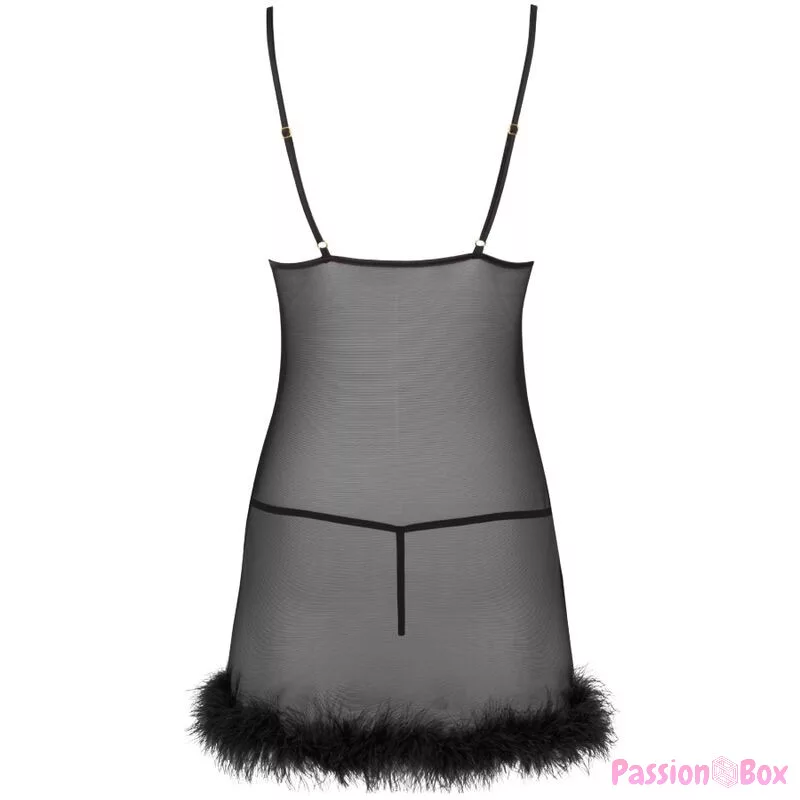 Zerunam is a product made from a mixture of polyamide and elastane, a very soft and pleasant to the touch material that adapts well to the body. The shirt does not scratch the skin, does not restrict movement and guarantees complete comfort of use. The set adapts to the shapes of the figure, but is not tight. Koszula reaches behind the thigh line, emphasizing the buttocks. The sophisticated black finish of the can makes the entire set look extremely flirtatious.