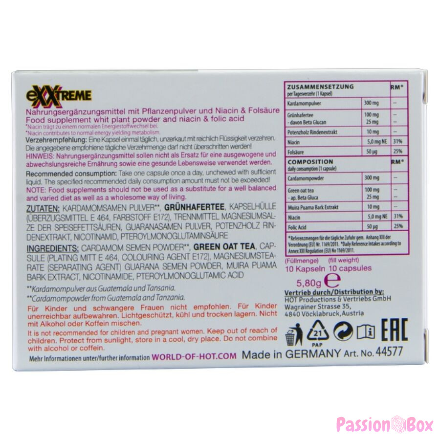 Cardamom Semen Powder, Green Oat Tea, Capsule (Plating Mitt E 464, Colouring Agent E172), Magnesiumstearate (Separating Agent), Guarana Semen Powder, Muira Puama Bark Extract, Nicotinamide, Pteroylmonoglutamic Acid.