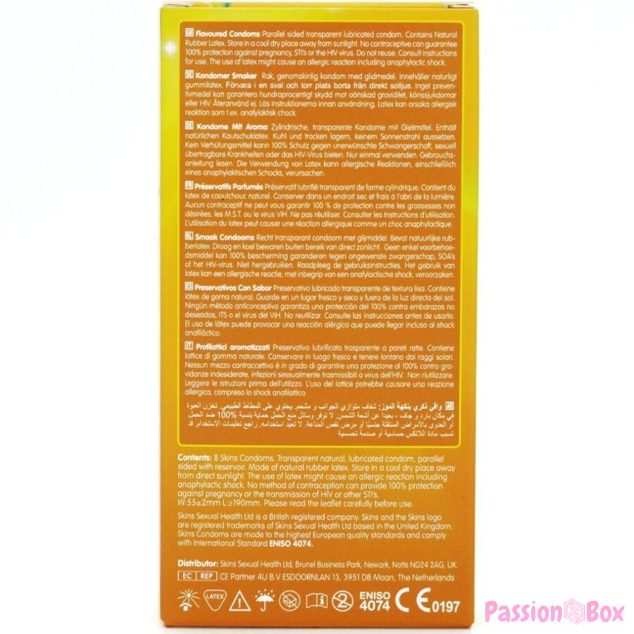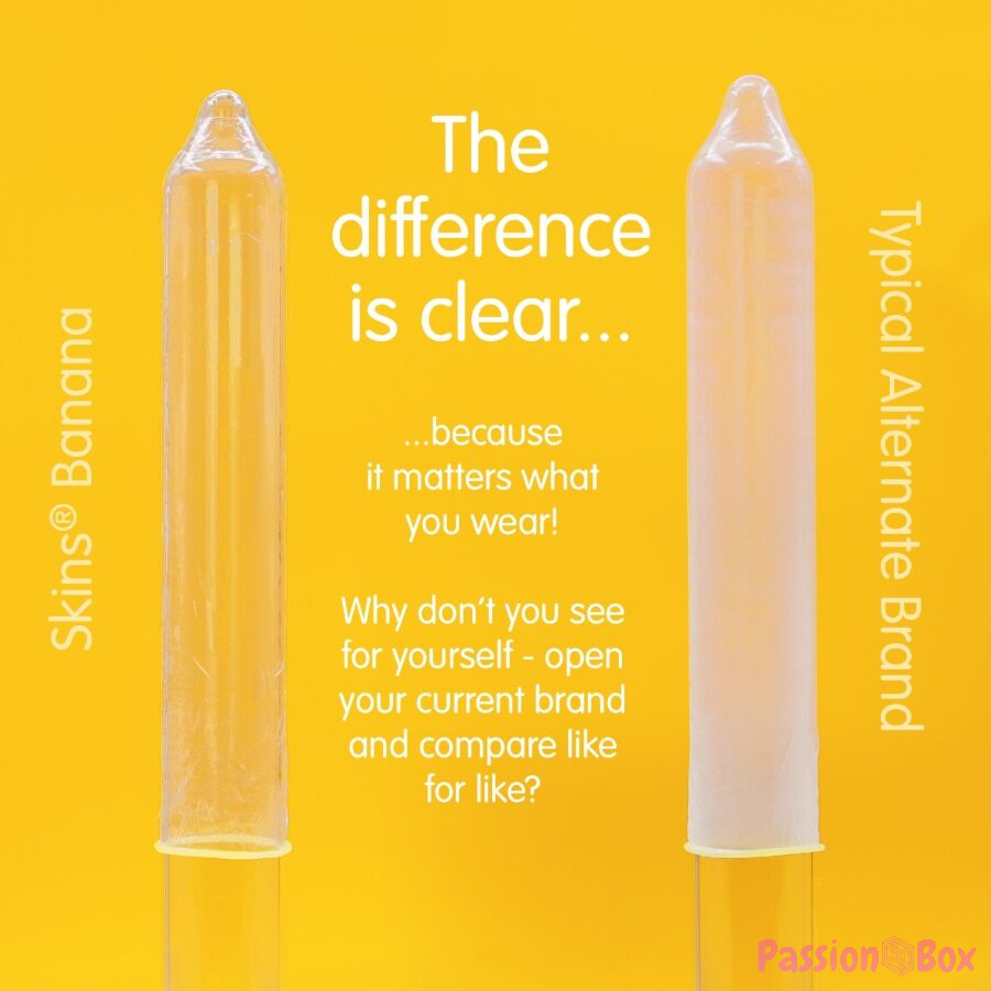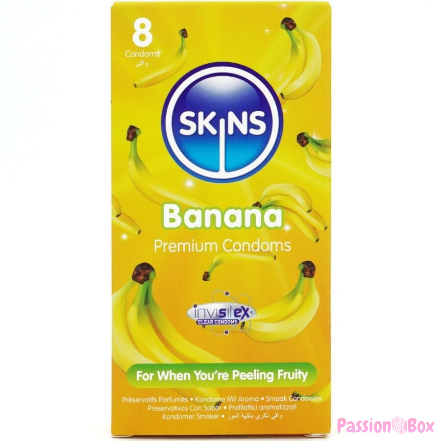 Introducing our new 8-pack of banana-flavored condoms, featuring a sleek, ready-to-use design. Enjoy a fun and premium experience with Skins banana-flavored condoms. Designed to combine fun and functionality, these individually wrapped condoms are ideal for stores looking to offer their customers a high-quality flavored option that stands out.