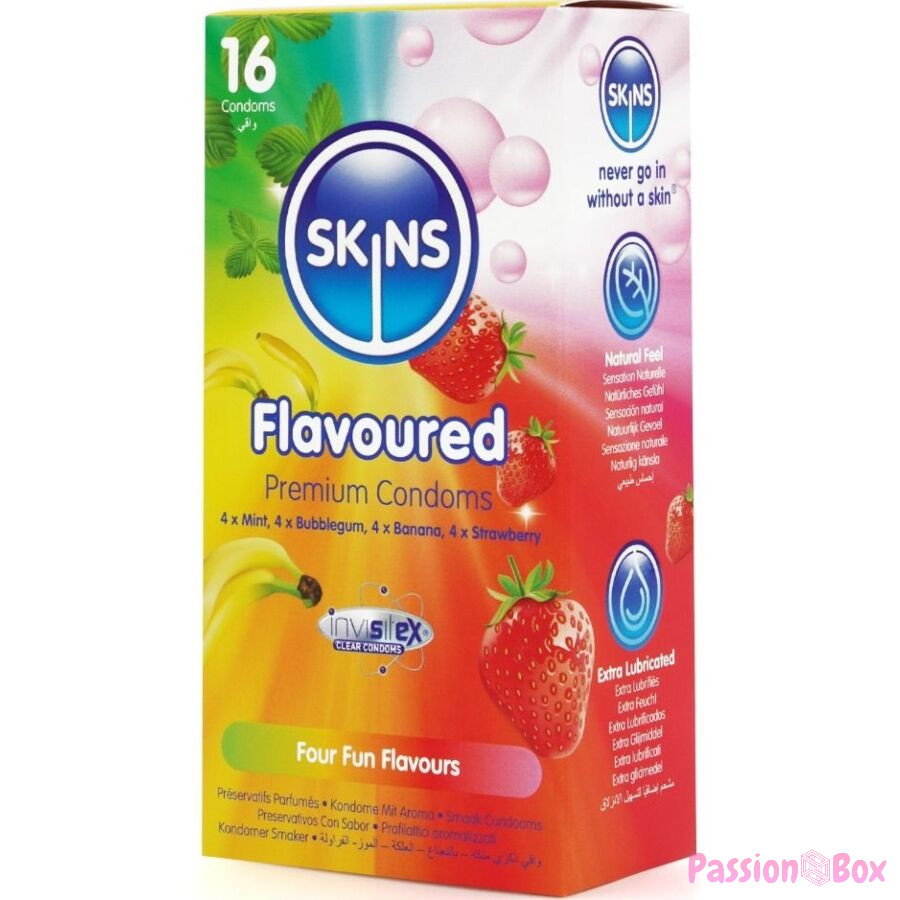 Introducing the Skins Flavored 16-pack: a stylish, ready-to-use solution that offers up to 33% more condoms per pack than the market leader. This exciting multipack includes four enticing flavors: Banana, Bubblegum, Mint, and Strawberry, giving consumers a fun and tasty way to enhance intimacy for any occasion. Each condom is individually wrapped and made with premium natural latex, providing a natural feel, transparency, and strength. Enriched with extra lubrication and delicious fragrances, these condoms eliminate the typical latex odor to ensure a more pleasurable experience.