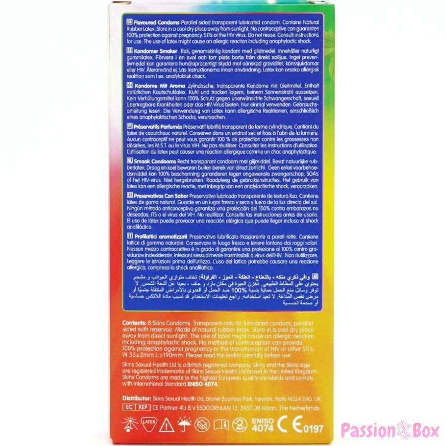 Introducing the Skins Flavor 8-pack: a stylish, ready-to-use solution that offers up to 33% more condoms per pack than the market leader. This exciting multipack includes four enticing flavors: Banana, Bubblegum, Mint, and Strawberry, giving consumers a fun and tasty way to enhance intimacy for any occasion. Each condom is individually wrapped and made with premium natural latex, providing a natural feel, transparency, and strength. Enriched with extra lubrication and delicious fragrances, these condoms eliminate the typical latex odor to ensure a more pleasurable experience.