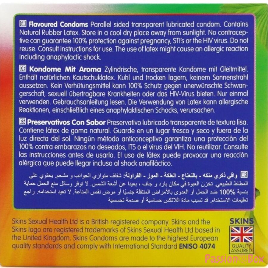 Introducing the Skins Flavored 4-Pack - a stylish, ready-to-use solution that offers up to 33% more condoms per pack than the market leader. This exciting multipack includes four enticing flavors - Banana, Bubblegum, Mint, and Strawberry - giving consumers a fun and tasty way to enhance intimacy for any occasion. Each condom is individually wrapped and made with premium natural latex, providing a natural feel, transparency, and strength. Enriched with extra lubrication and delicious fragrances, these condoms eliminate the typical latex odor to ensure a more pleasurable experience.