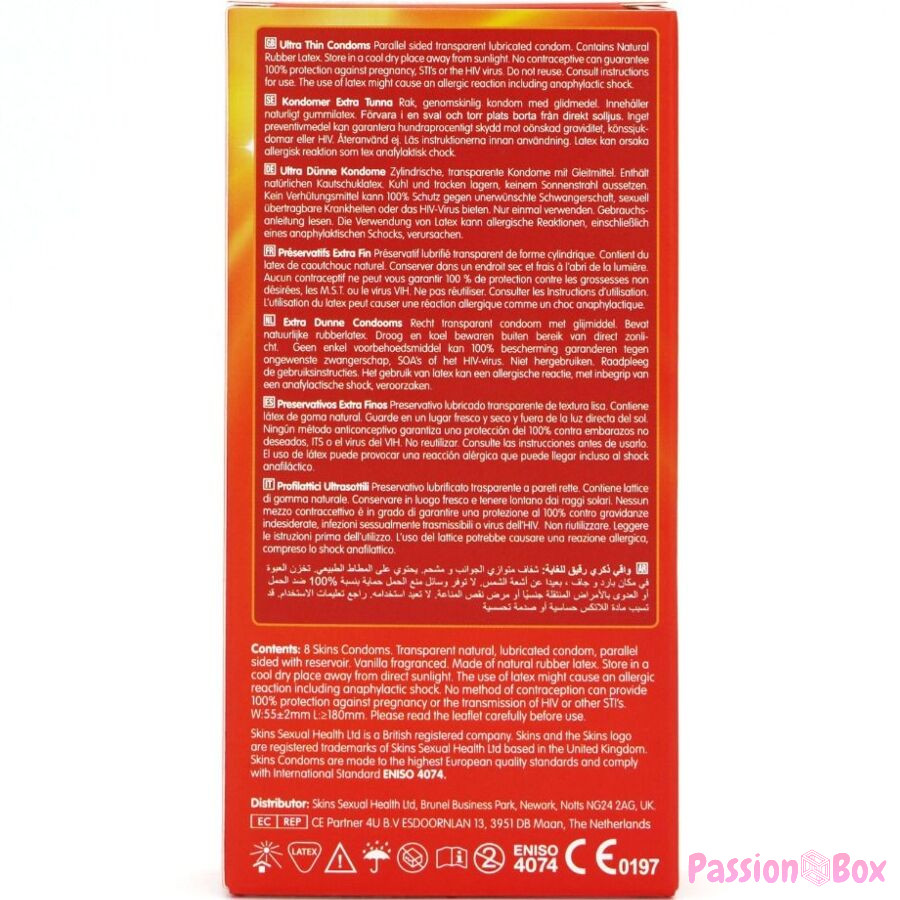 Introducing the Skins Ultra Thin 8-Pack - a value-priced, ready-to-use product that offers up to 33% more condoms per pack than the market leader. Designed for customers seeking ultimate intimacy with reliable protection, this pack is ideal for retailers looking for a premium, high-performance essential. Skins Ultra Thin condoms offer all the benefits of Skins Natural, but with an even thinner design for an even more intimate feel. Made with premium natural latex, they offer strength, transparency, and a second-skin feel, making them the ideal choice for those who prioritize sensation. Feel even closer to your partner with the Skins Ultra Thin condom, strong yet incredibly thin. With all the features of Skins Natural, but even thinner, wearing a Skins Ultra Thin feels like a second skin.